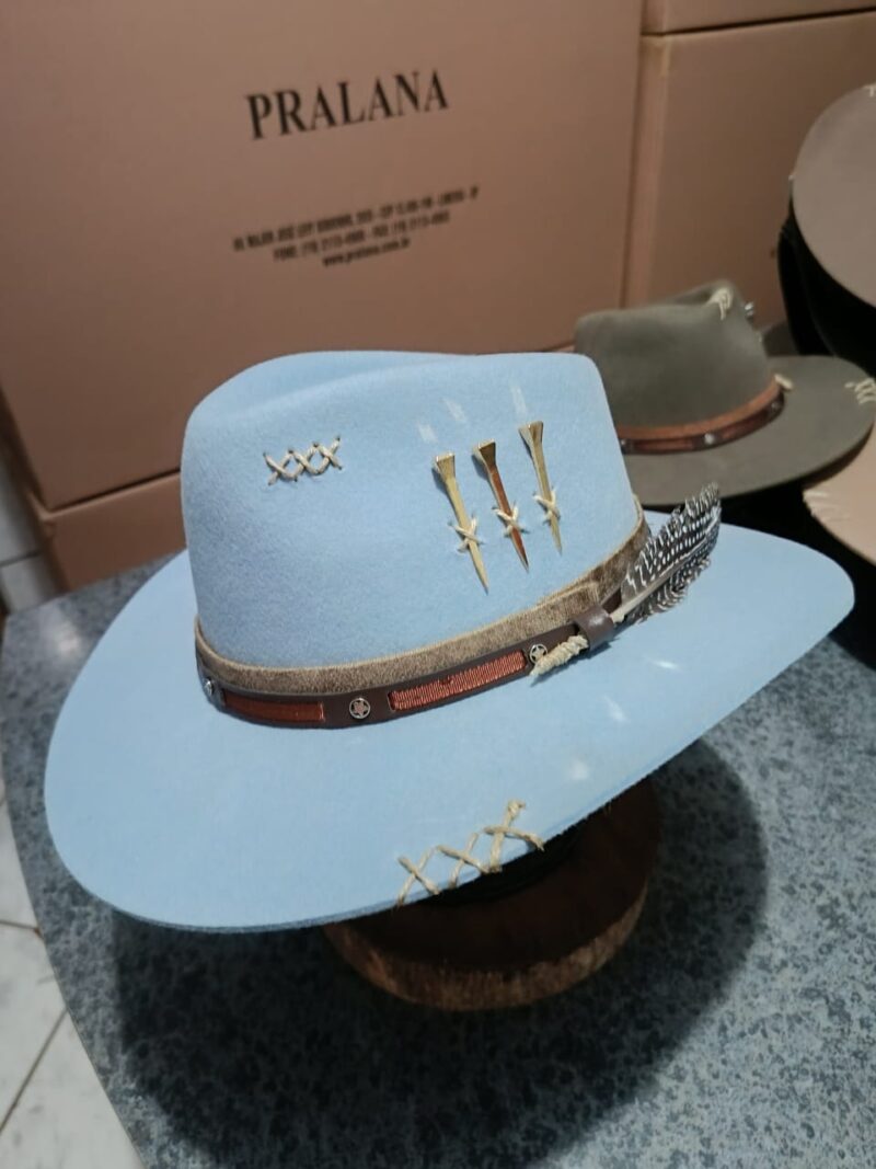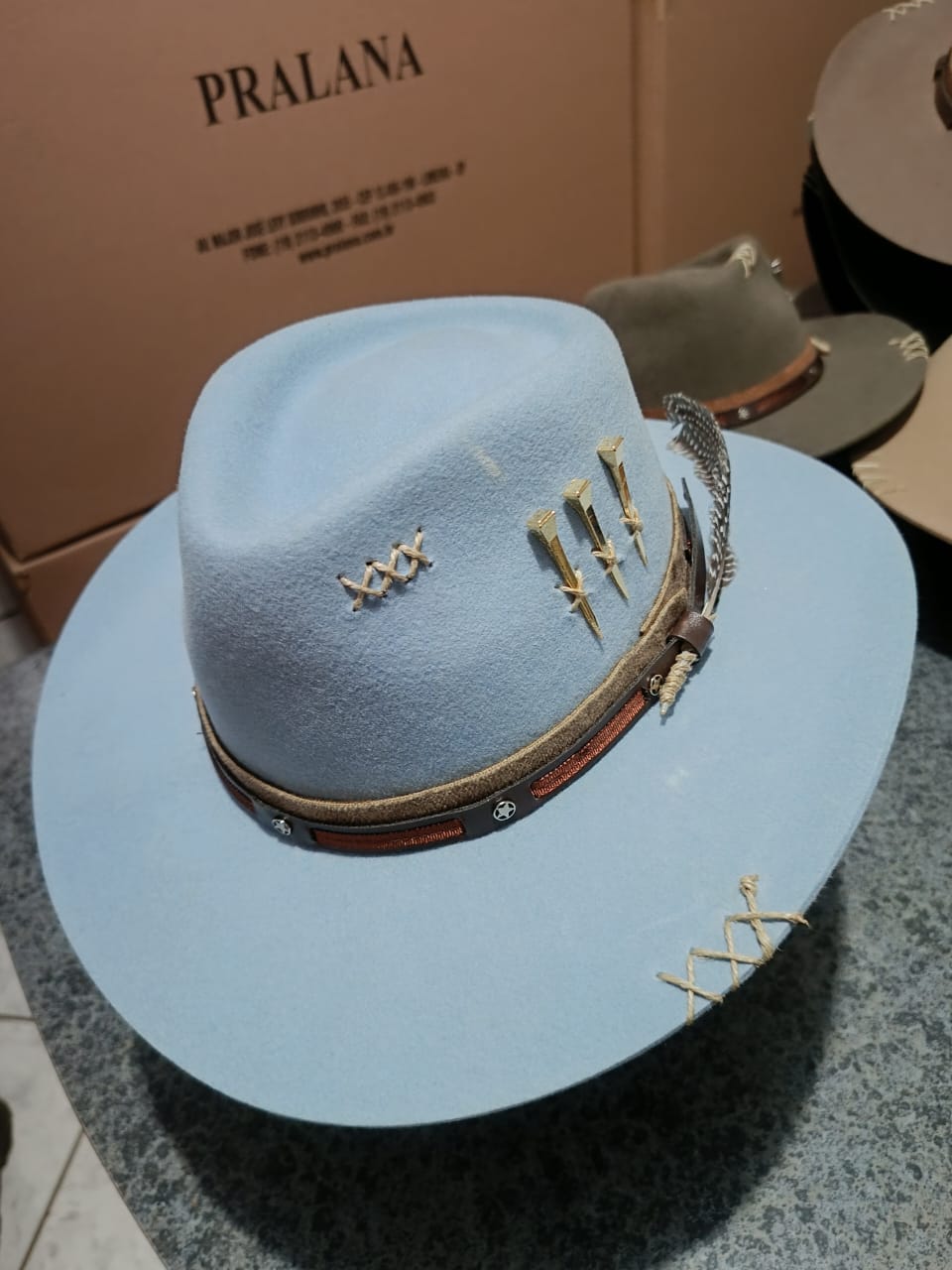 Chapeu Personalizado 3 Cravos De Ferradura Aba 7.5 Azul Pastelo Original Pralana M